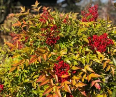 Descrizione: Portamento eretto, cespuglioso. Crescita veloce. Le foglie nascono rosso-bronzo, passano al verde a maturità per poi diventare rosso acceso in inverno. Piccoli fiori bianchi che lasciano il posto ad appariscenti bacche rosse. Predilige un terreno fertile e ben drenato. Sono piante molto adatte ad essere coltivate come esemplari singoli, o in siepi colorate; le varietà nane si utilizzano anche nelle bordure o nel bordo misto.