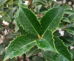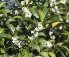Descrizione: Arbusto dalla chioma tondeggiante e ascendente. Foglie ellittiche o ovali, dai bordi spinosi, verdi scure sopra e verdi chiare sotto, di 6-8 cm di lunghezza e 4-5 cm di larghezza. Fiorisce in estate-autunno con fiori ascellari bianchi e profumati, ma non molto vistosi. Rustico, indenne alle malattie e molto resistente ai parassiti, viene usato per siepi che non richiedono manutenzione.