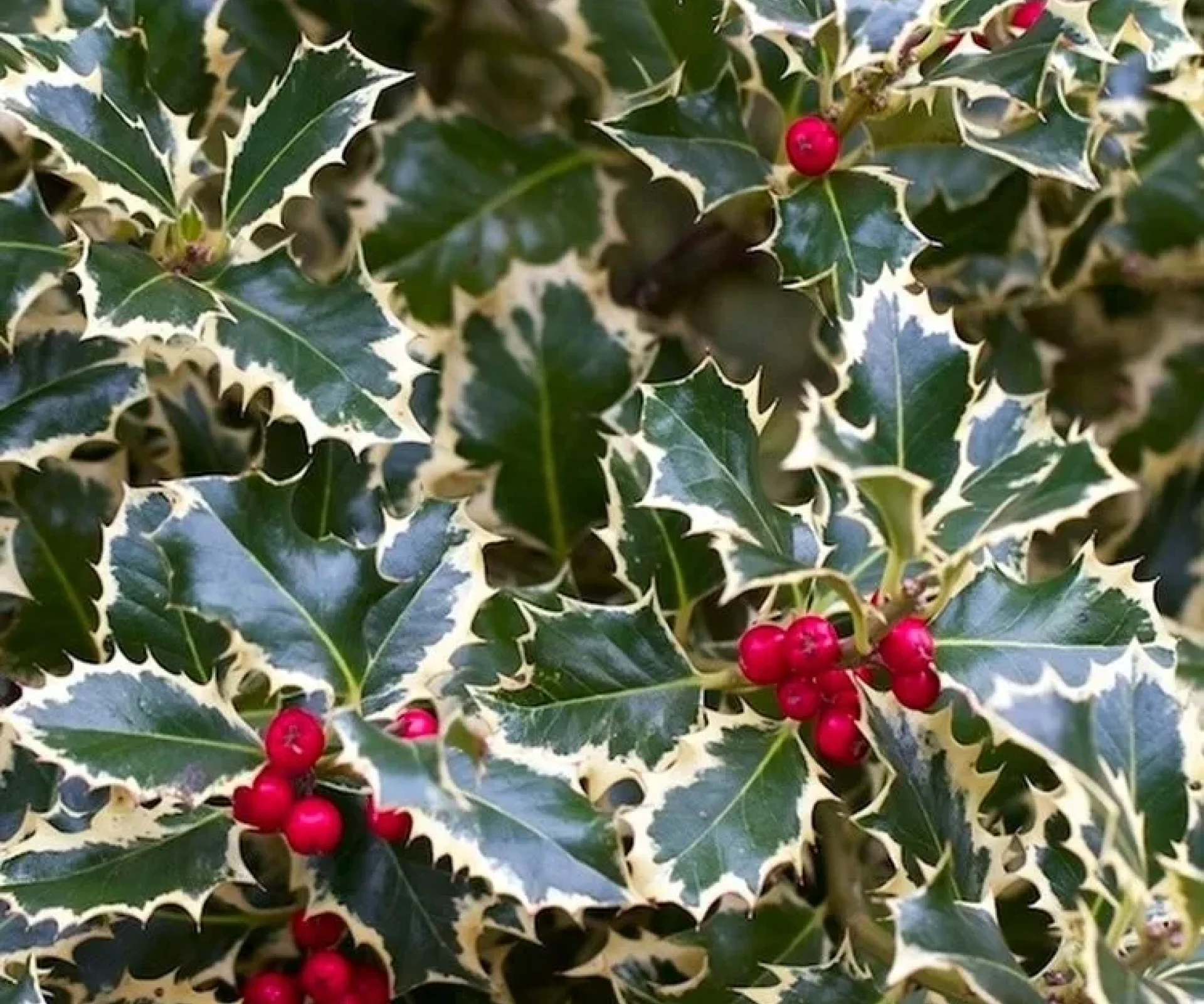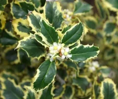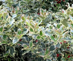 Descrizione: Arbusto ornamentale sempreverde con foglie spinose di colore verde lucido marginato di bianco e fiori bianchi che si trasformano in bacche rosse in inverno, in contrasto cromatico con il fogliame. Può essere usato come esemplare isolato in giardini rocciosi anche in posizione ombreggiata oppure, sopportando bene la potatura, può essere utilizzato per siepi o per arte topiaria. La sua crescita è lenta e raggiunge i 4m circa.
